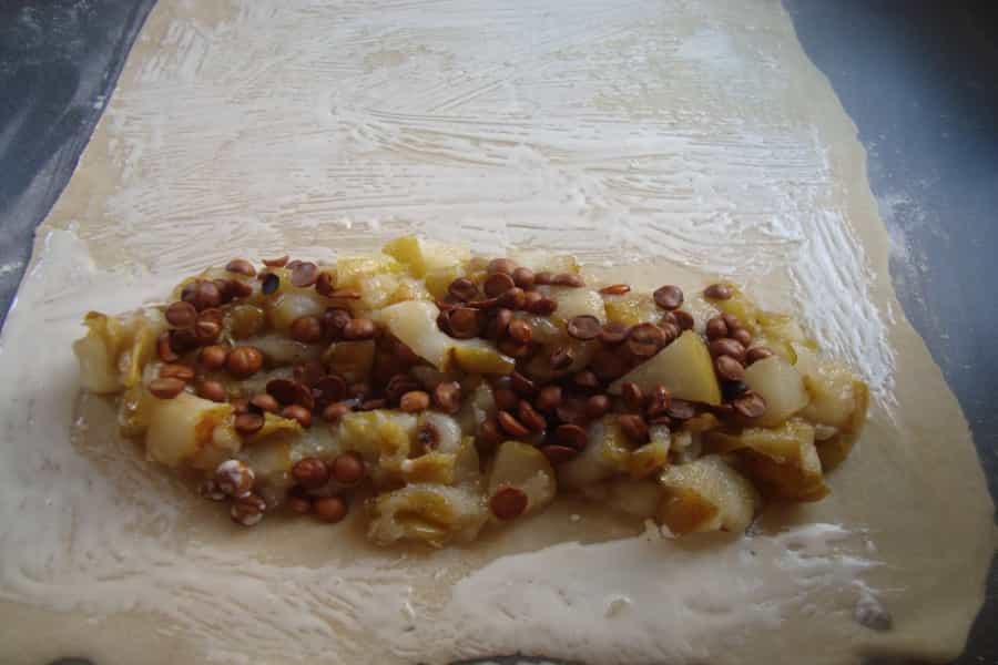 En un recipiente mezclar harina, sal, huevo batido, la mantequilla a temperatura ambiente y agua tibia poco a poco. Amasar hasta formar una masa blanda. Dejar reposar por 1 hora. Transcurrido el tiempo de reposo, con ayuda de un uslero estirar la masa de tal forma que quede bien fina. Extender la masa sobre un paño limpio, un papel mantequilla o en la mesa enharinada. Pincelar con mantequilla derretida y colocar el relleno de peras, espolvorear las avellanas.