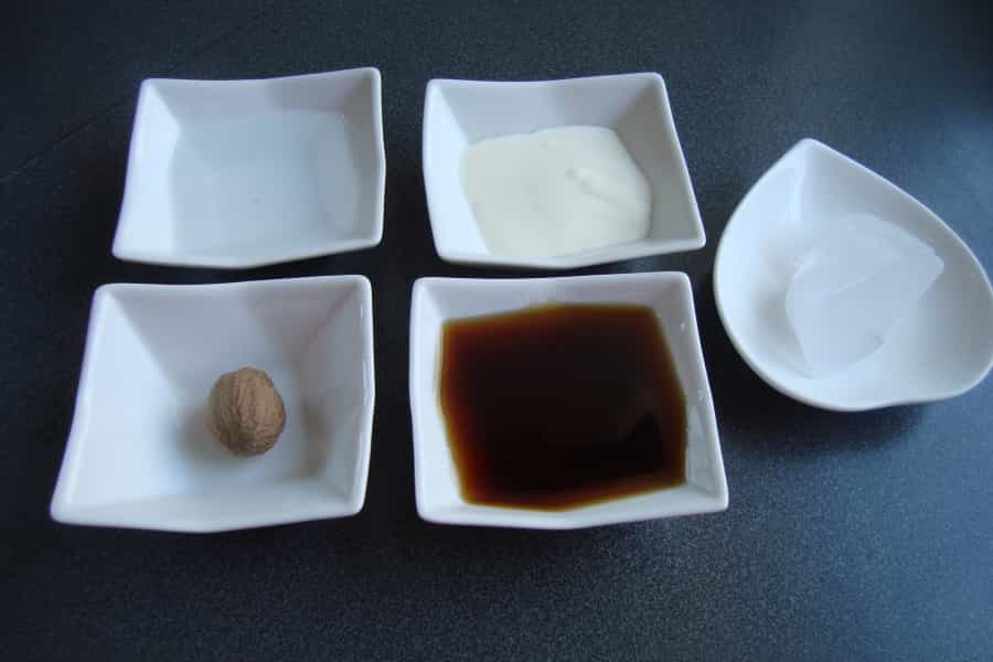 Mezclar todos los ingredientes en una coctelera con hielo, excepto la Nuez moscada. Batir y servir. Espolvorear nuez moscada sobre el trago.