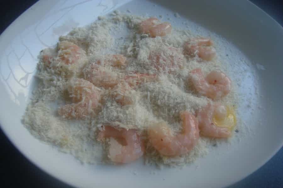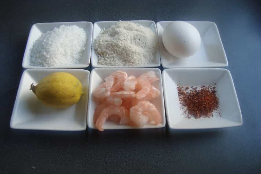 Pasar los camarones por huevo, luego pasarlos por la mezcla de panko y coco.