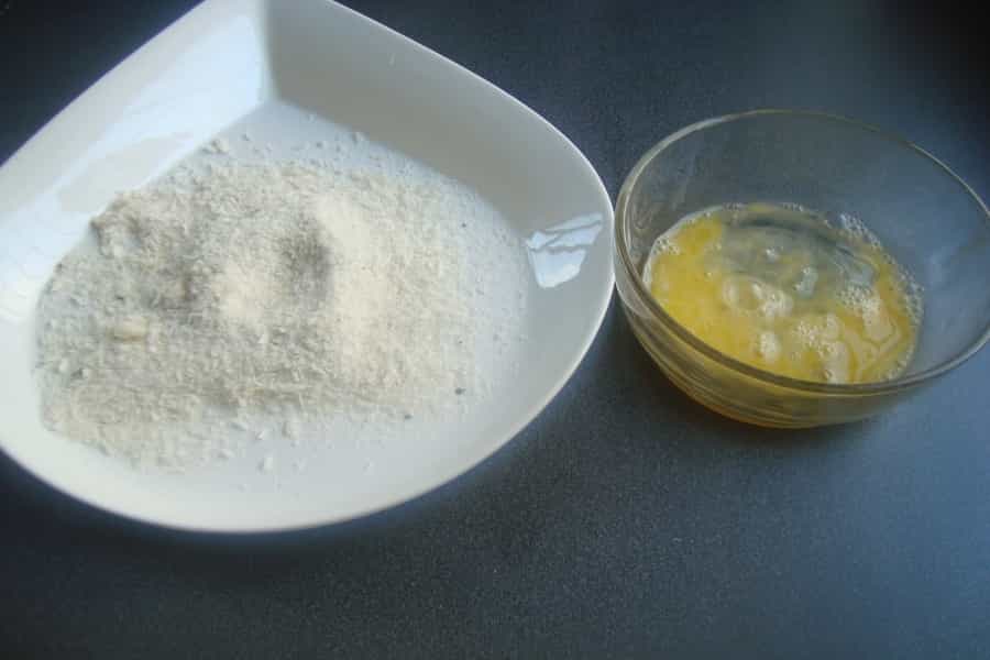 En un recipiente batir los huevos. En un plato plano mezclar el panko y el coco rallado.