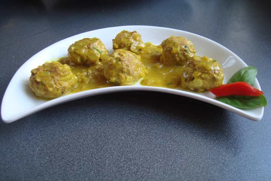 Servir las bolitas de carne al curry calientes bañadas en su salsa.