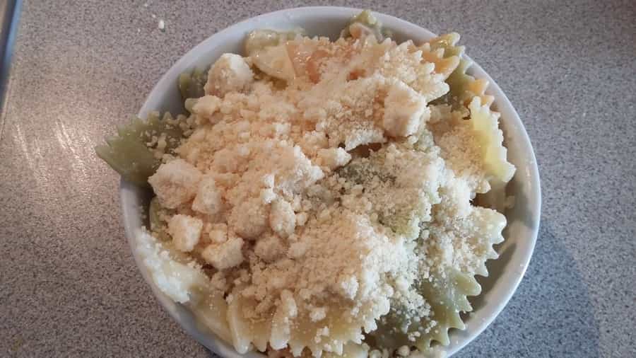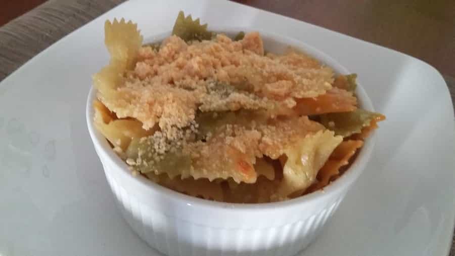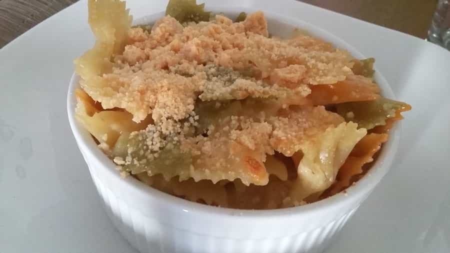 Coloca la pasta en un envase para horno pequeño, empolvorea algo más de queso por encima y coloca en el horno a modo gratén por 10 minutos, a 150°C.