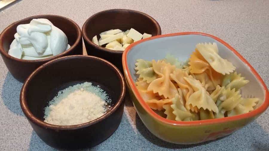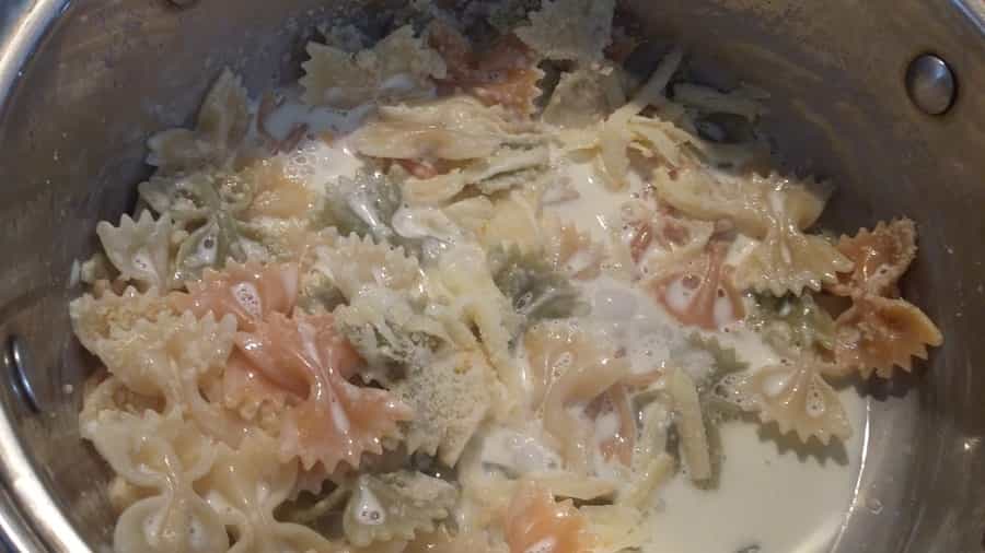 En una sartén pequeña coloca la pasta cocida y agrega la crema espesa. Una vez que ese mescla se acople bien, agrega los dos tipos de queso y baja del fuego.