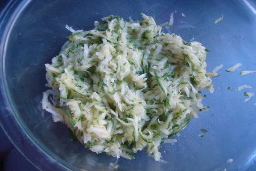 Lavar el zapallo italiano, eliminar los extremos y rallarlo usando por la parte gruesa del rallador. Escurrir bien, se debe presionar para eliminar la mayor cantidad de liquido posible. Añadir un poco de sal y dejar reposar por 20 minutos. Transcurrido el tiempo de reposo volver a escurrir y reservar.
