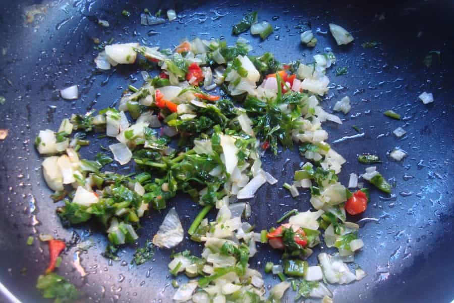 En un sartén con 2 cucharadas de aceite caliente, sofreír a fuego medio por 5 minutos la cebolla picada en cubos pequeños, el diente de ajo y el pimentón picado, incorporar orégano, tomillo, salpimentar a gusto. Dejar enfriar.