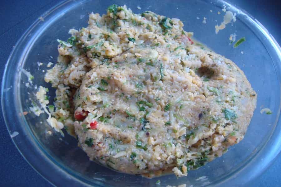 En un recipiente mezclar los garbanzos molidos, el zapallo italiano rallado y el sofrito de verduras, añadir 1 huevo y la harina. Con las manos amasar y formar una mezcla homogénea. Rectificar la sazón y dejar reposar por 30 minutos en el refrigerador.