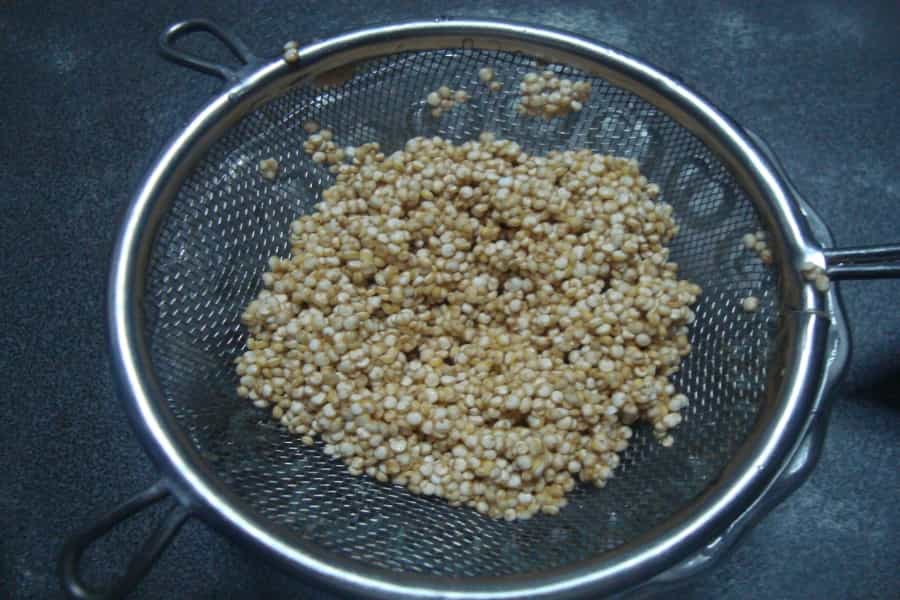 Colocar la quínoa en un colocador, lavar bien bajo la llave de agua fría. Revolver con la mano y lavar durante dos minutos. Luego dejar escurrir y reservar.