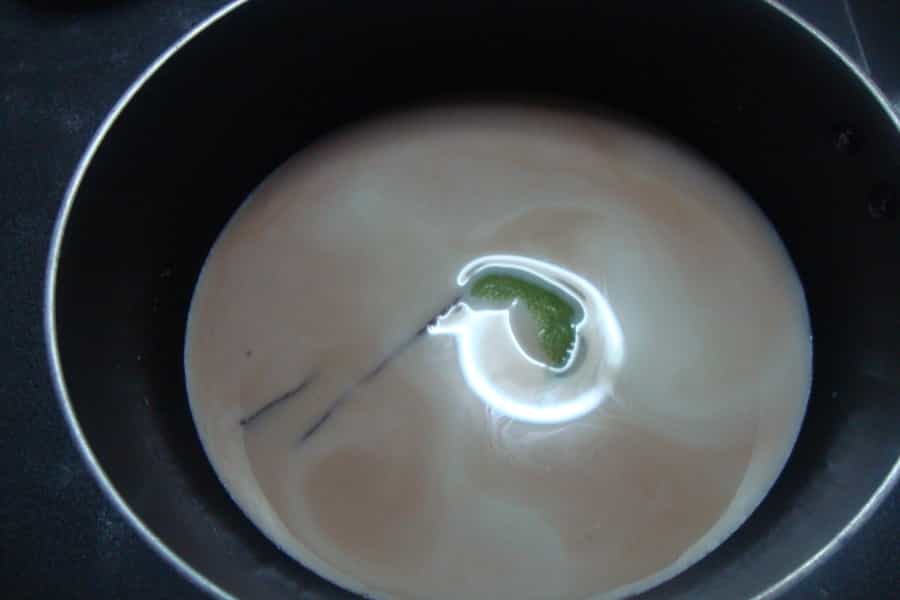 En una olla cocinar leche, vainilla, canela y cascara de limón, al momento de comenzar a hervir, eliminar la cascara de limón y la canela.