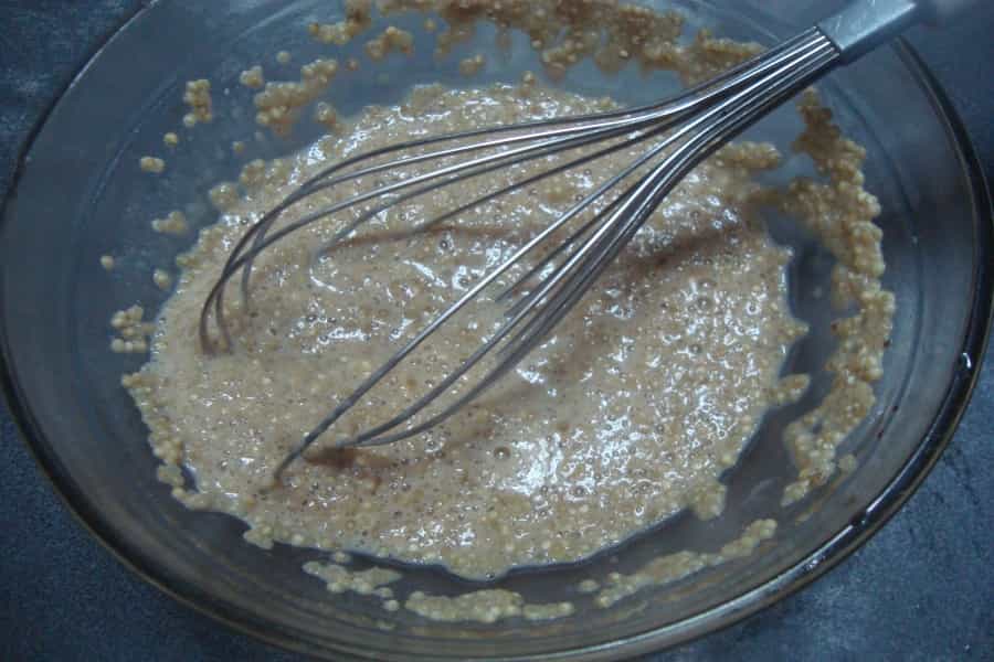 Añadir la quínoa lavada, azúcar y cocinar a fuego bajo por 15 minutos o hasta que comience a espesar, revolviendo ocasionalmente para que no se pegue. Una vez que la quínoa este cocida, verterla en recipiente y con ayuda de un batidor manual o un tenedor, batirla suavemente hasta enfriar.