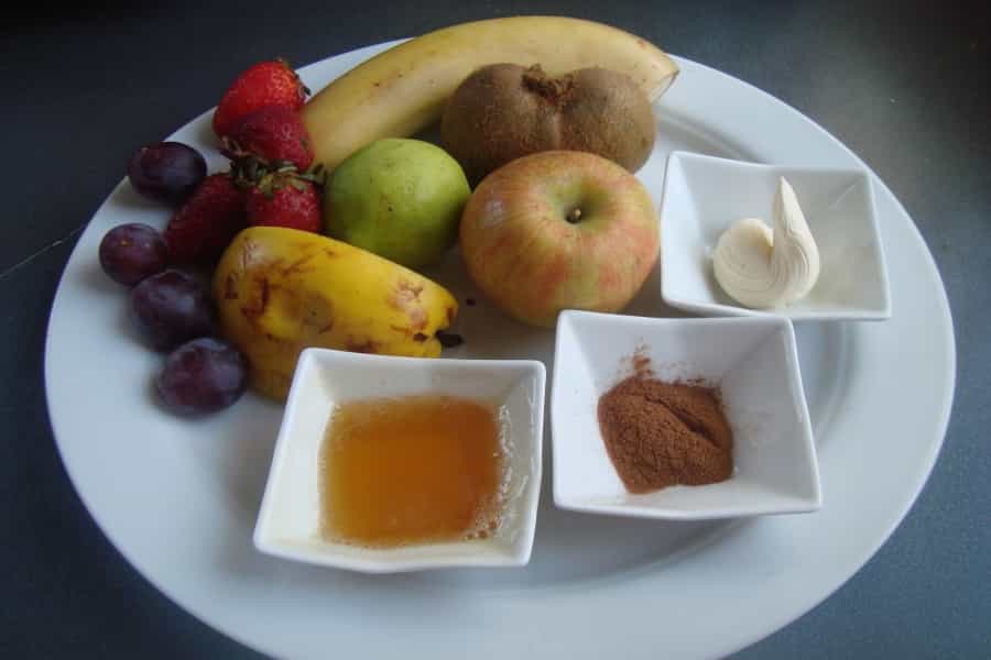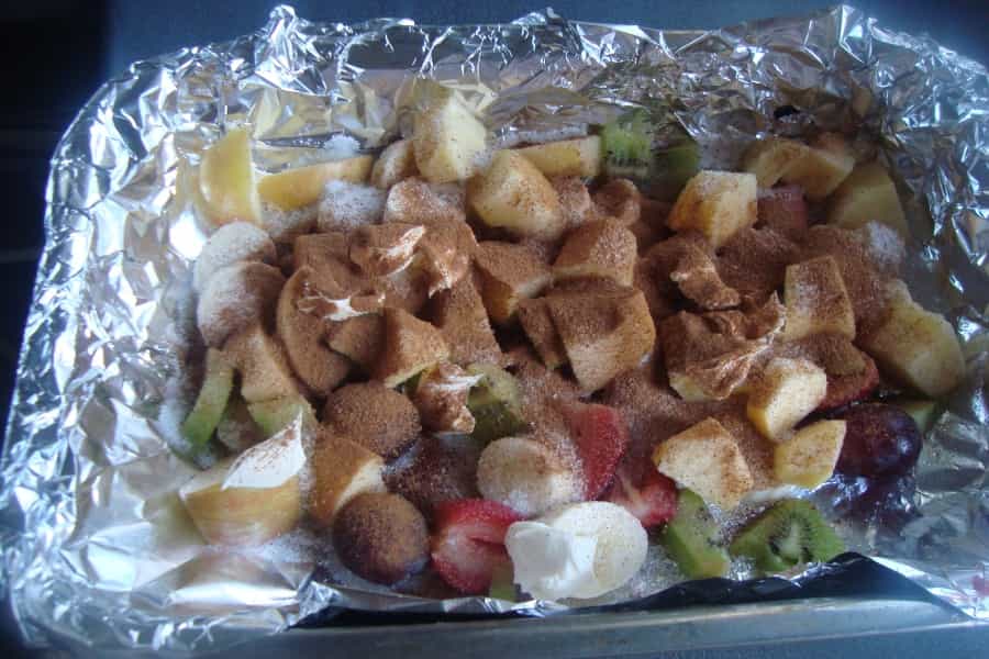Colocar la fruta en la fuente, encima distribuir los trozos de mantequilla y la miel, espolvorear con la canela, el jengibre y el azúcar.