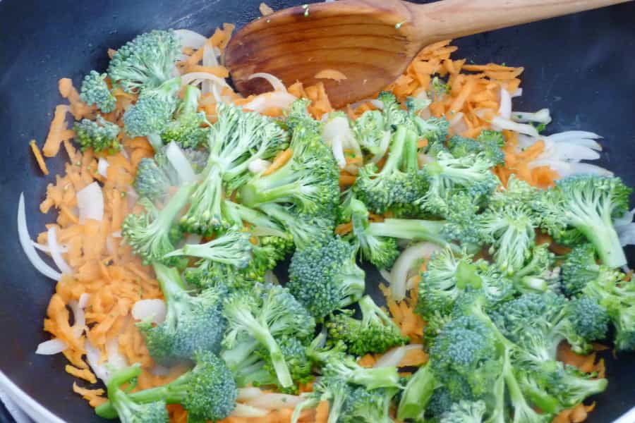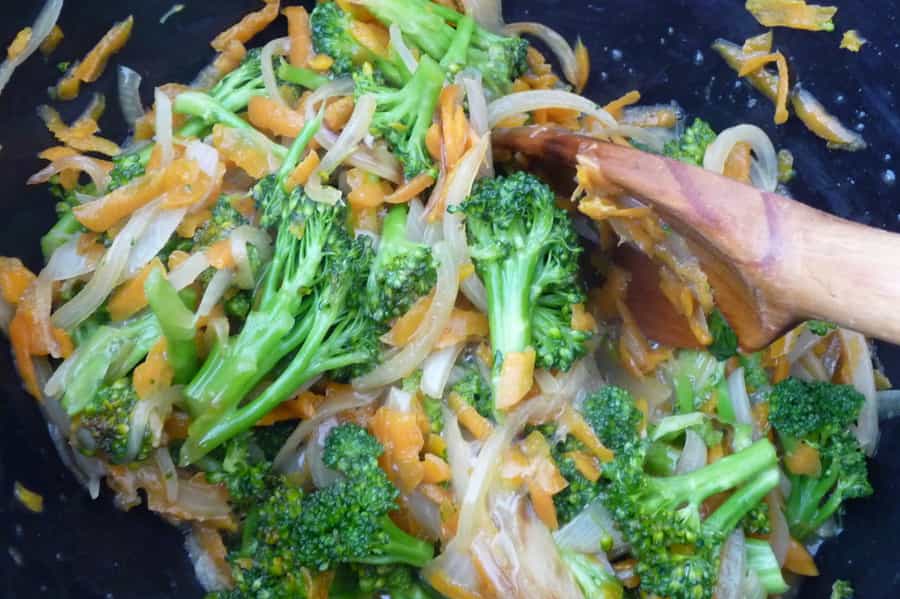 Mientras, corta la cebolla en pluma, ralla la zanahoria y corta el brócoli en trozos medianos. Sofríe la cebolla. Cuando esté transparente, agrega sal y pimienta a gusto. Luego, incorpora las zanahorias ralladas y el brócoli. Saltéalos por unos 15 minutos. Puedes agregar un chorro de agua si es necesario. Reserva.