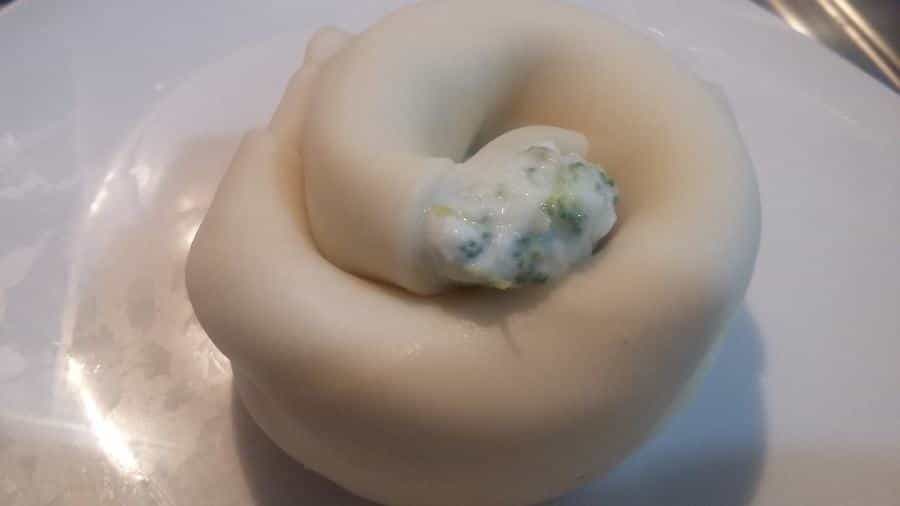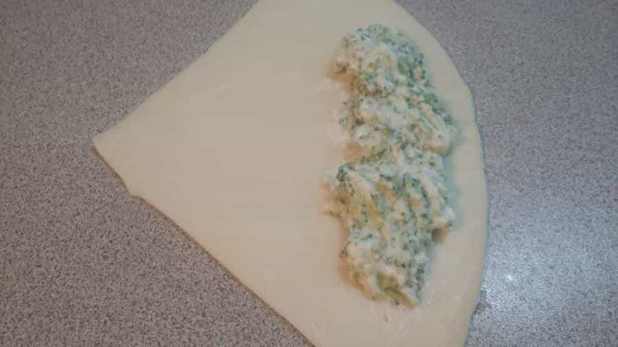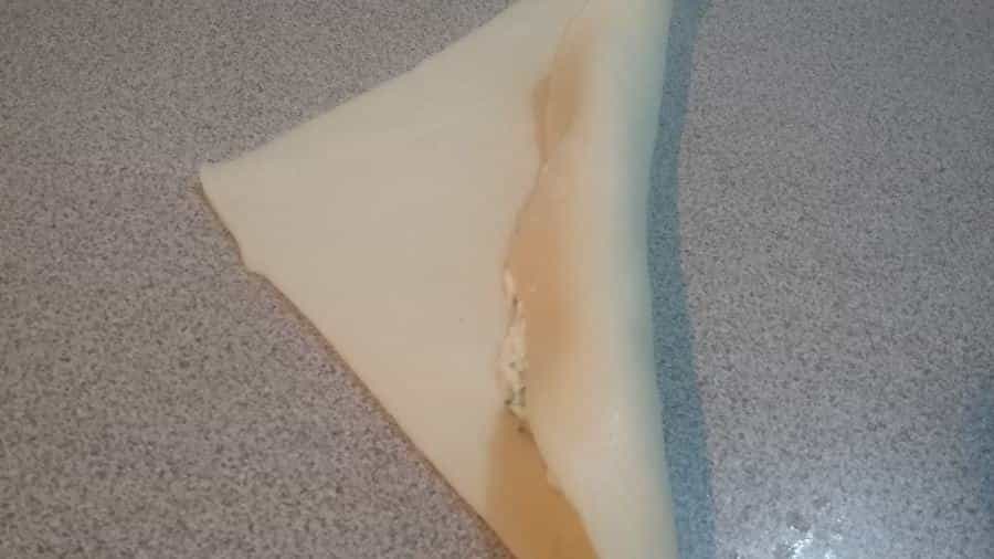 Coloca la mescla en el borde grande de la masa de hoja y enrolla como un tubo.
