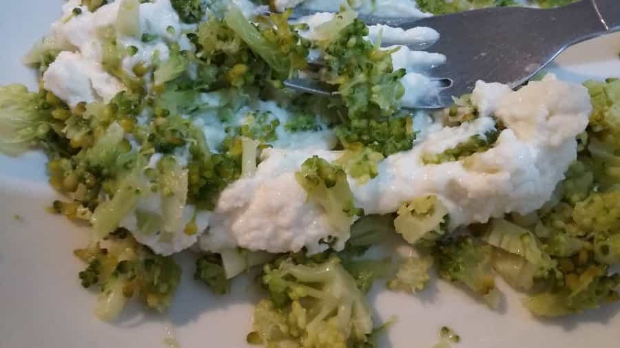 Corta bien pequeño las flores y los tallos del brócoli y mézclalos bien con el queso ricota