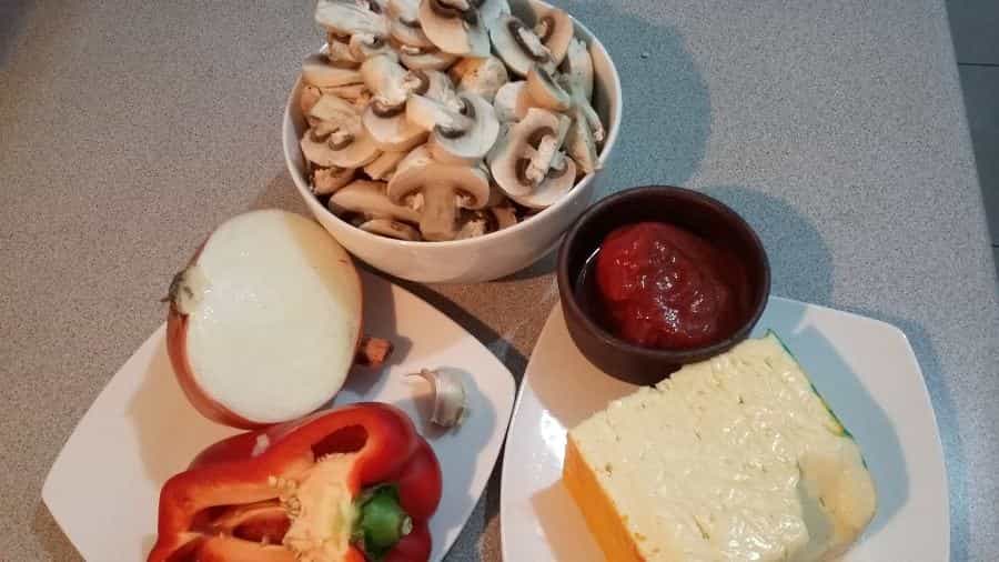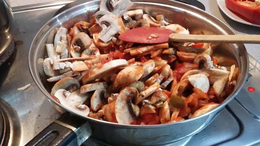 Dora en una sartén la cebolla, el pimentón y el ajo machacado. Pasados 5 minutos agrega los champiñones y mantenlos cocinando. Recuerda que el champiñón suelta líquido, por lo cual no debes taparlos para que no quede aguada la salsa.10 minutos después agrega la pasta de tomate, rectifica de sal y baja del fuego.
