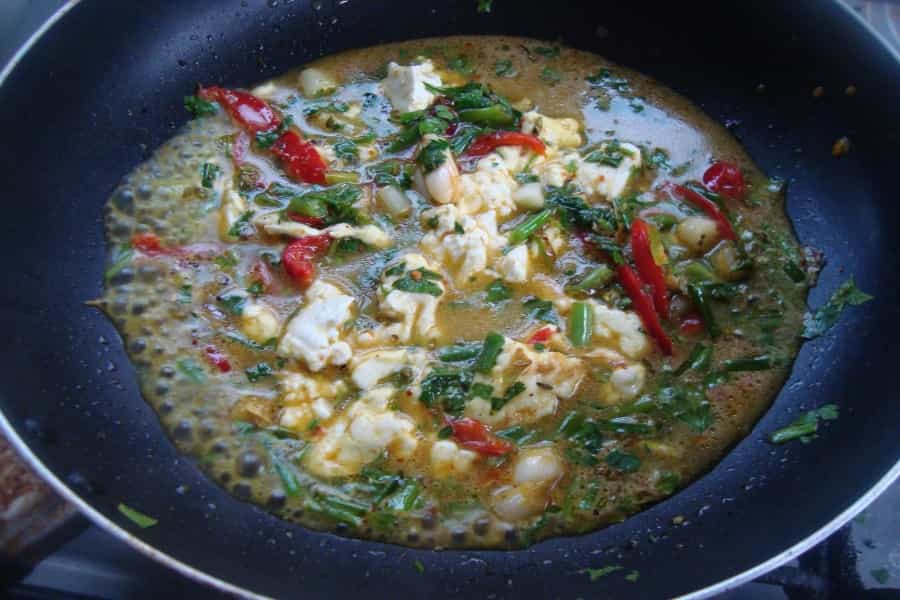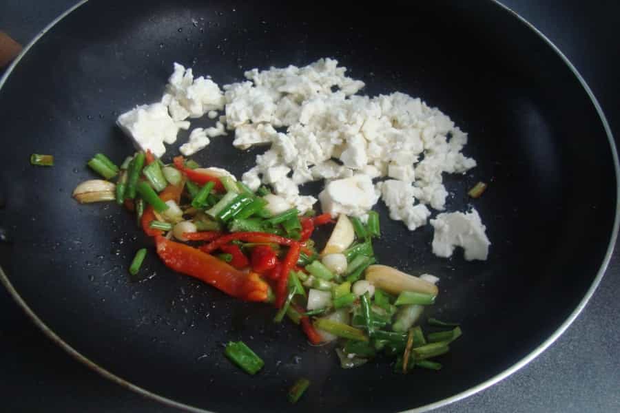 Mover las verduras salteadas a un lado, al otro lado del sartén colocar el tofu desmenuzado, saltear por 2 minutos.