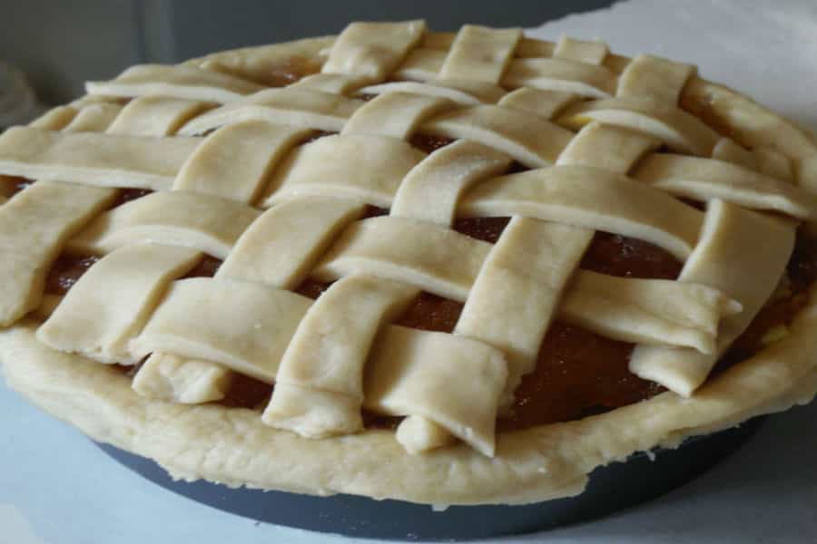 Posteriormente cubrimos las manzanas con la mermelada de manzana y naranja y lo cubrimos con las tiritas de masa elaborados con la masa que reservamos al principio de la preparación.