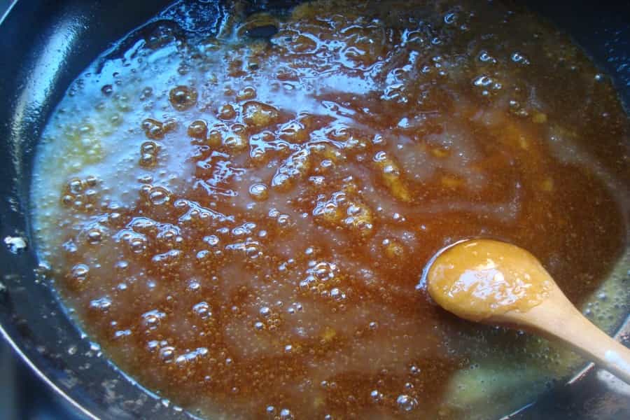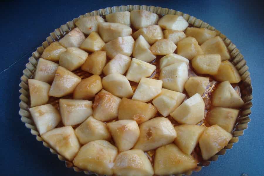 Pelar las manzanas, eliminar las semillas, cortarlas en 4 partes y cada parte por la mitad, colocarlas en una fuente con el jugo de un limón. Colocar un sartén al fuego con 1 ¼ taza de azúcar, cocinar a fuego bajo sin revolver hasta formar un caramelo, incorporar 110 gramos de margarina, revolver hasta integrar bien.