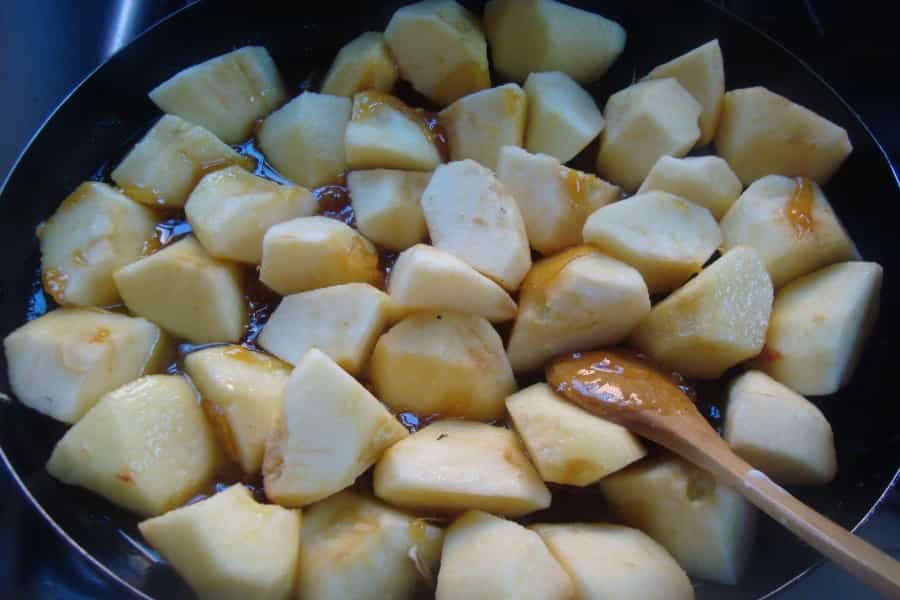 Añadir las manzanas partidas y cocinarlas a fuego bajo por 15 a 20 minutos, dándolas vuelta para que se caramelicen por todos lados. Apagar y dejar enfriar.
