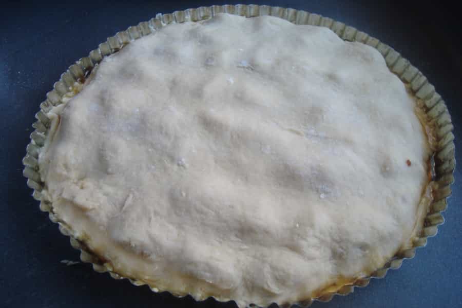 Transcurrido el tiempo de reposo de la masa retirarla del refrigerador y en una mesa enharinada estirarla de forma circular dejándola de unos 5 centímetros más del tamaño del molde. Disponer la masa sobre las manzanas y doblar la masa sobrante entre las manzanas y el molde.