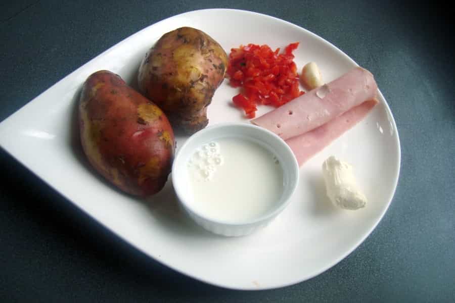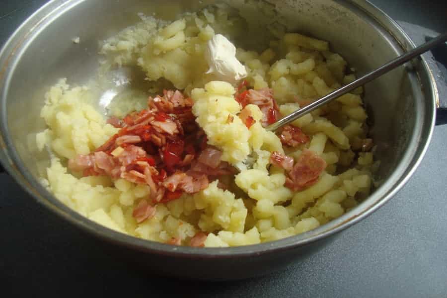 Una vez que las papas estén cocidas y blandas, escurrirlas y eliminar todo el exceso de agua, en la misma olla calentar crema y mantequilla a fuego bajo, una vez que se derritan incorporar las papas y prensar hasta obtener un puré (puedes utilizar la batidora). Incorporar el sofrito de jamón y verduras, salpimentar a gusto y revolver suavemente hasta incorporar bien. Servir caliente.
