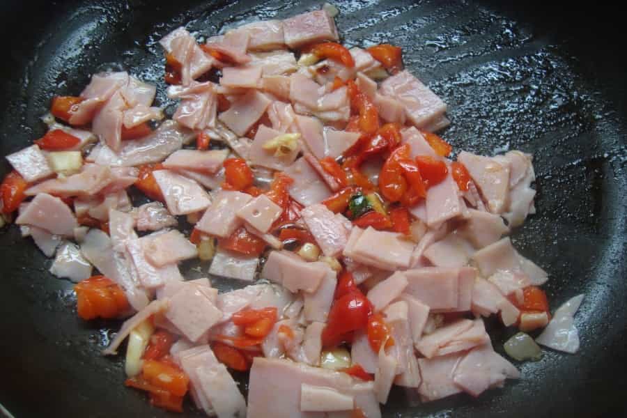 En un sartén con 1 cucharada de aceite caliente sofreír por 3 minutos cebolla, pimentón y ajo todo picado fino, añadir el jamón cortado en cuadrados, revolver y cocinar por 5 minutos. Apagar y reservar.
