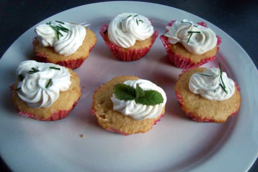 Cuando los cupcakes estén tibios, colocar una capa de crema agria en la superficie y espolvorear con el eneldo restante.