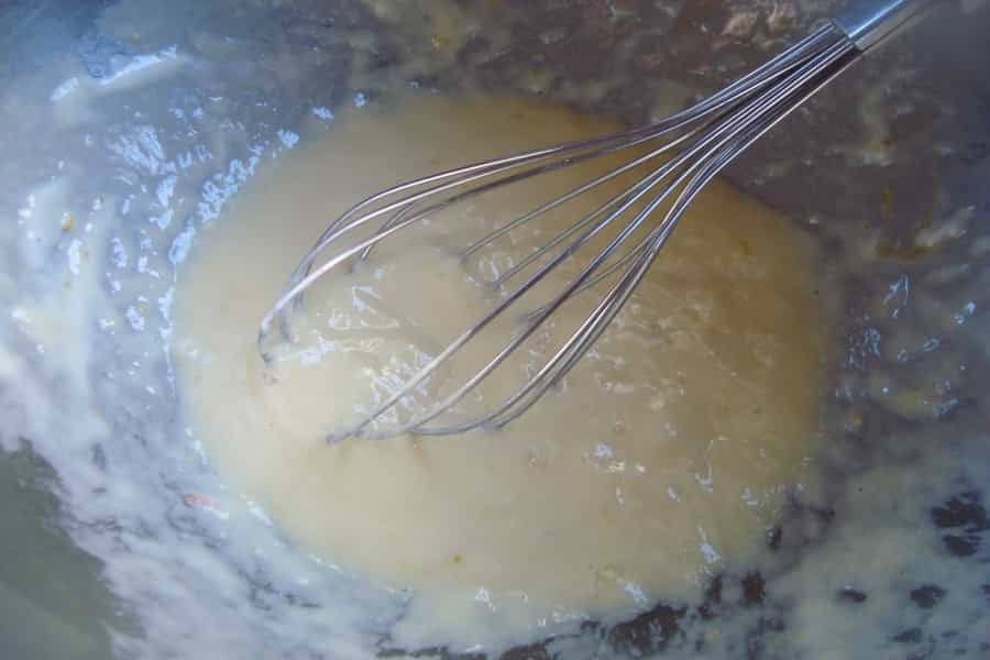 En un recipiente mezclar la crema batida o el queso crema con 2 cucharadas de jugo de limón, revolver hasta obtener una crema lisa y un tanto agria.