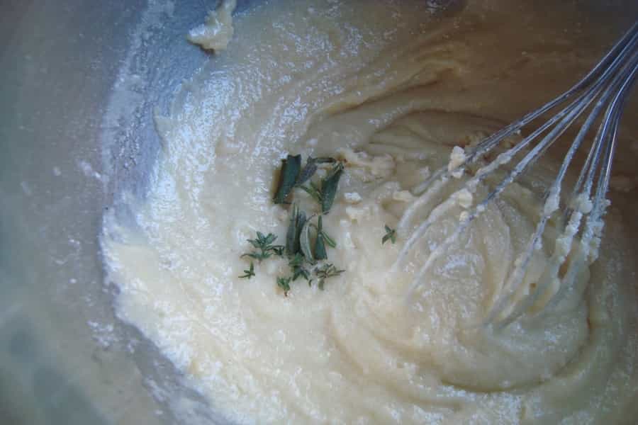 Agregar 2 cucharadas de eneldo o tomillo o ciboulette picado, revolver suavemente hasta integrar bien.