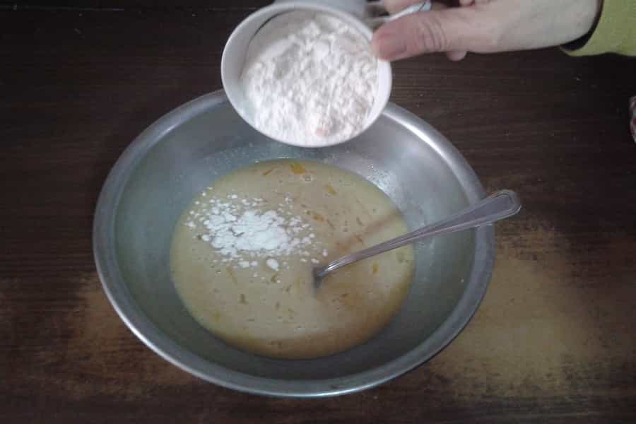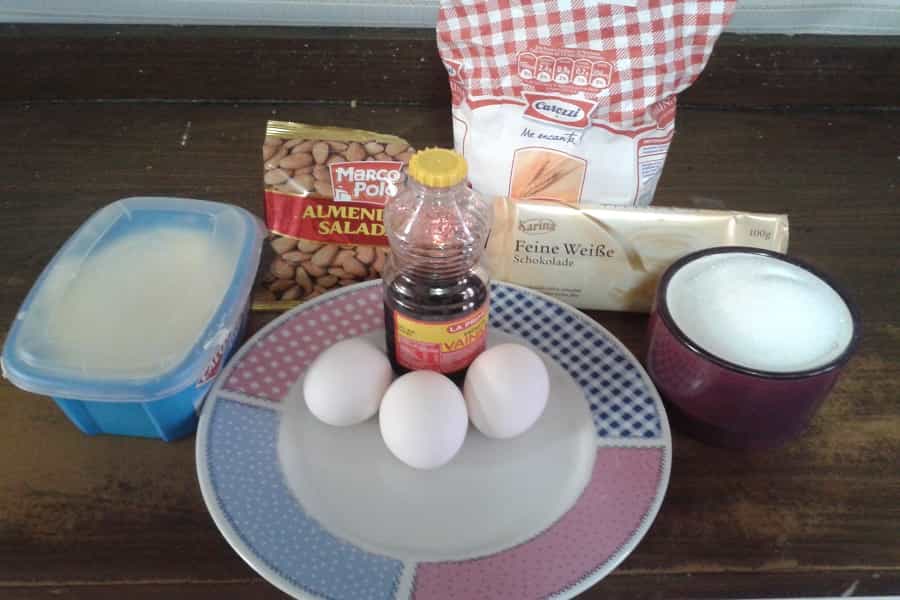 2.Una vez unidos, se debe batir con un tenedor lo más rápido posible. Lo importante, es generar una mezcla líquida. Cuando esté listo, debemos agregar la harina. Es fundamental, ir incorporándola de a poco, mientras se revuelve la mezcla. Ya terminado este paso, se le agregan las almendras. Si compras saladas, puedes remojarlas en agua, para quitarle la sal. De todas maneras, aunque las compres sin sal, igual puedes sumergirlas en agua, porque te facilitará el trabajo de cortarlas por la mitad. Se vuelven más blandas.