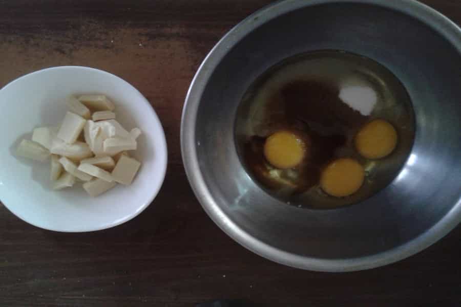 1.Vamos a dividir en dos recipientes diferentes los ingredientes. En uno, pondremos la mantequilla y las barras de chocolate blanco. Y en el otro, los huevos, la esencia de vainilla y el azúcar. El primer recipiente debe ser especial para utilizarlo en microondas, pues debemos derretir ambos ingredientes, hasta que queden líquidos. Cuando ello ocurre, podemos unirlos con el segundo recipiente.
