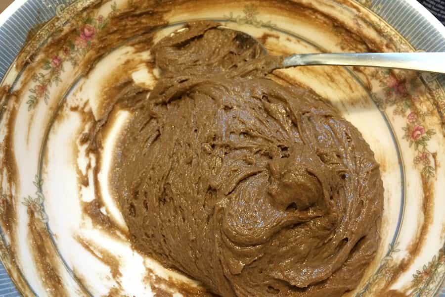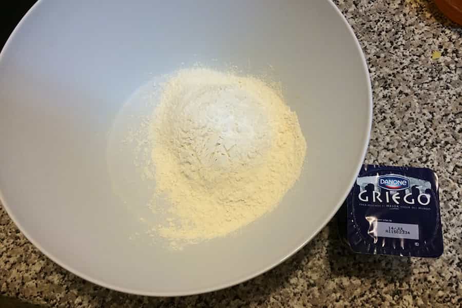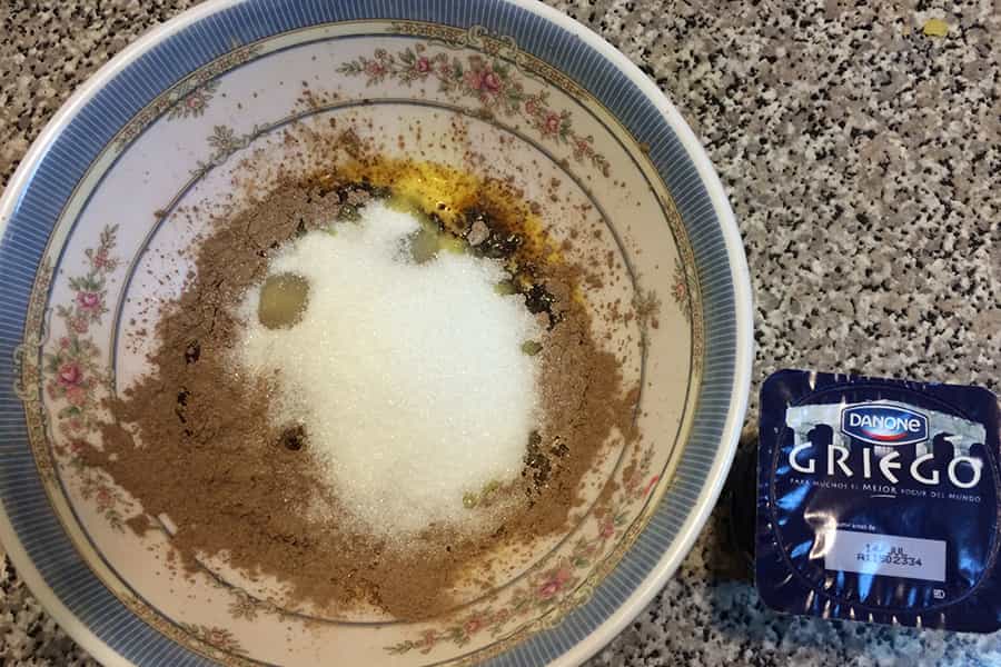 Cuando hayas integrado todos los ingredientes, añade el Yogur Griego y la esencia de vainilla y vuelve a mezclar todo. Una vez hecho, agrega los ingredientes secos que tenías apartados. Vuelve a integrar todo y el resultado debe ser una pasta con consistencia pero húmeda, no buscamos una masa.