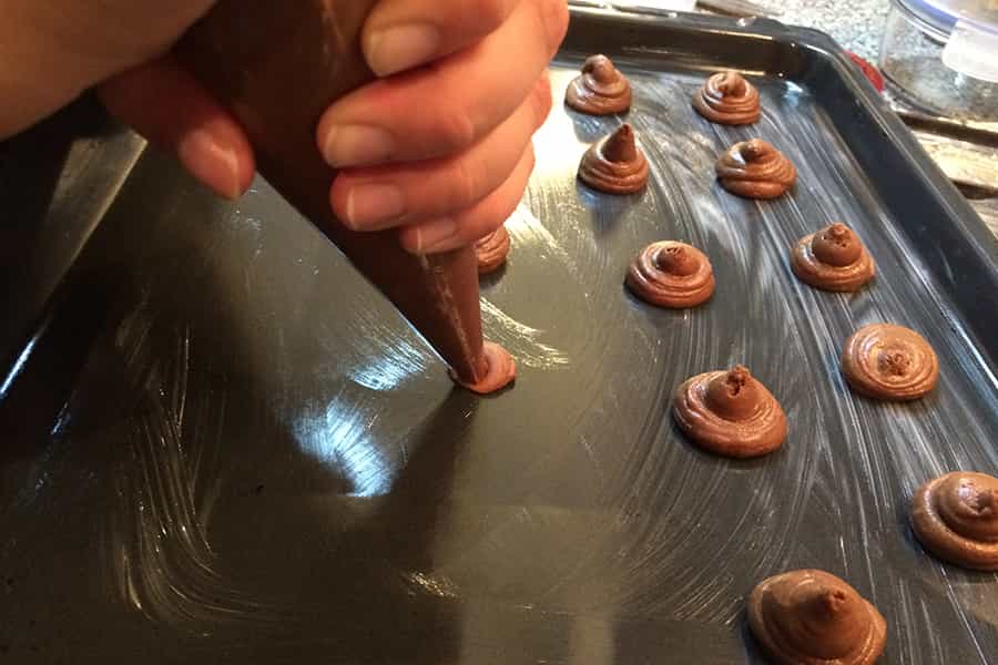 Toma una manga pastelera y llénala con tu mezcla. Elige la bandeja de horno que quieras ocupar y enmantequíllala. Luego, empieza a formar las galletas. Ten cuidado al ubicarlas, ya que con el calor las galletas crecerán. Asegúrate que tengan el espacio necesario para hacerlo.