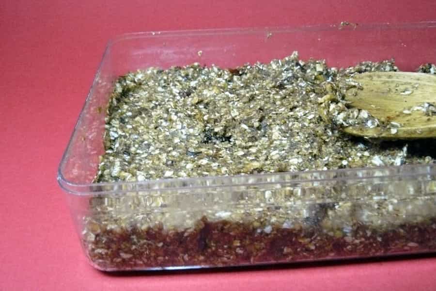 Colocamos la mezcla en una fuente rectangular o cuadrada. Esta dará la forma a la barrita.