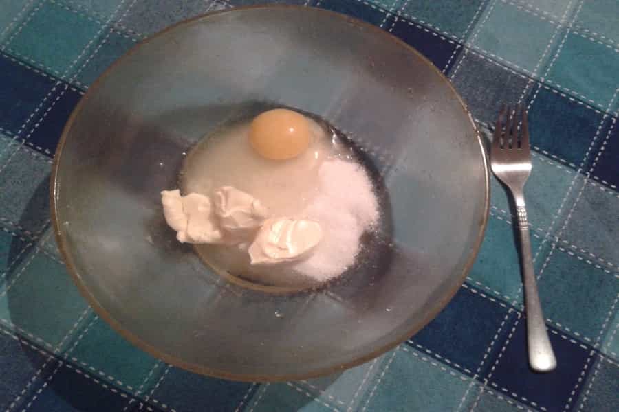 1. En un recipiente, mezclar los siguientes ingredientes en este orden: Mantequilla, huevo, azúcar y vainilla. Une con un tenedor, hasta que todos los productos estén bien compactos.