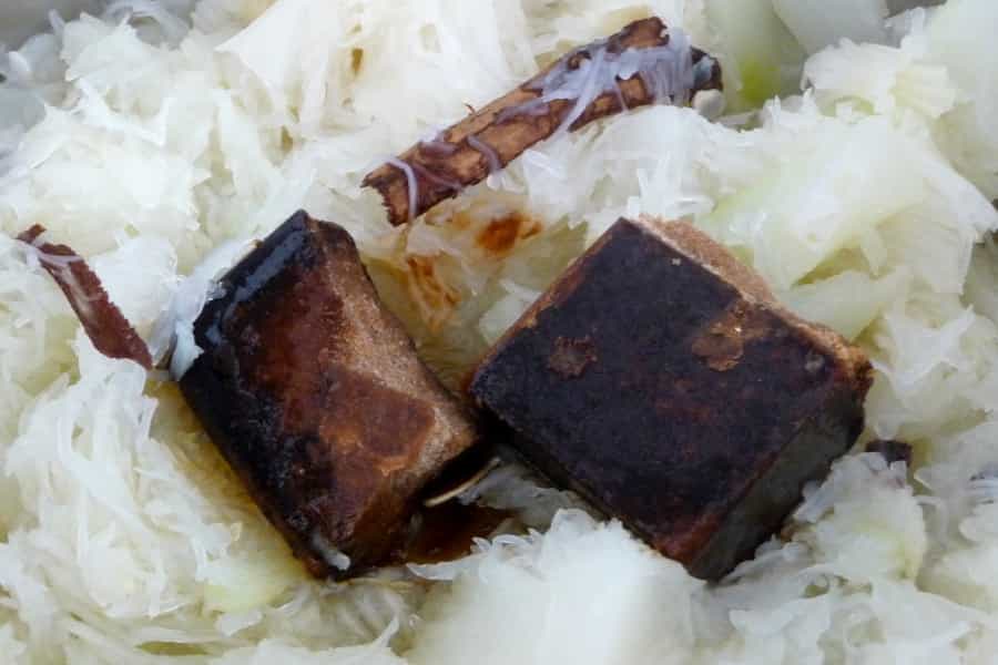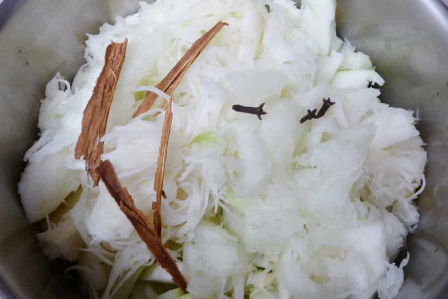 Pon la pulpa en una olla con dos tazas de agua, palos de canela y clavo de olor.