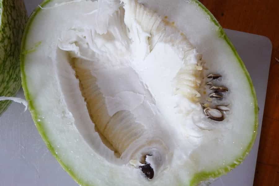 La alcayota tiene una cáscara muy dura por lo que hay varias opciones para sacar su pulpa. Una es golpear la cáscara y pelarla cuidadosamente, luego córtala en trozos pequeños. Otra es partirla en la mitad, con una cuchara y tenedor saca toda la pulpa hasta que quede sólo la cáscara verde. Puedes aprovechar de eliminar las semillas.