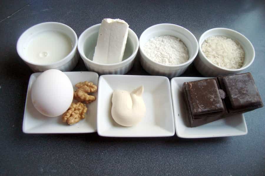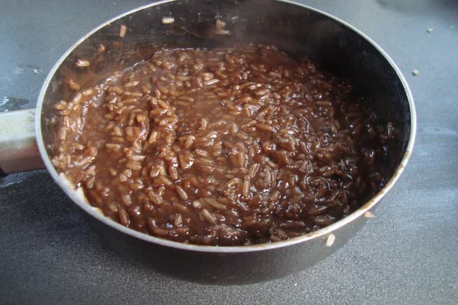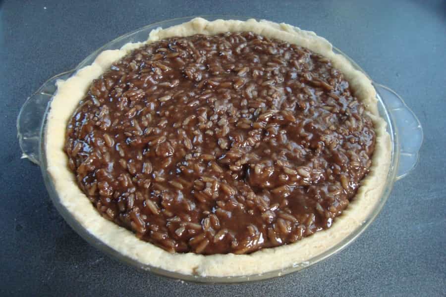 Para el relleno: en una olla cocinar a fuego medio el arroz con 300 mililitros (ml) de agua, hasta que el arroz esté cocido y el agua se haya evaporado. Retirar del fuego y agregar el chocolate picado, revolver hasta que el chocolate se derrita y este totalmente integrado. Agregar el azúcar, los huevos y las nueces picadas, revolver suavemente hasta integrar bien.