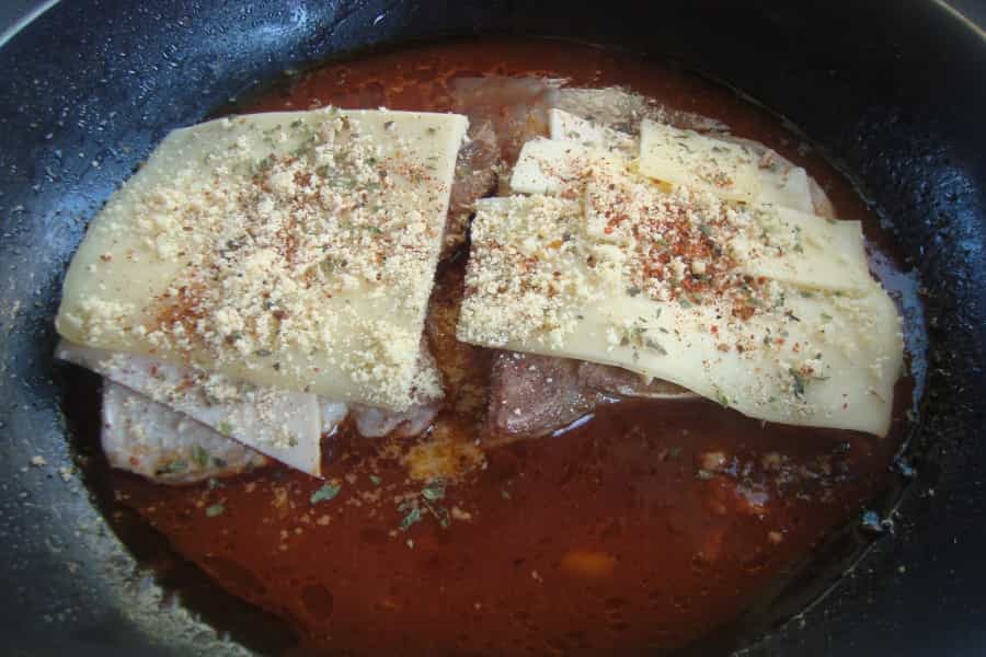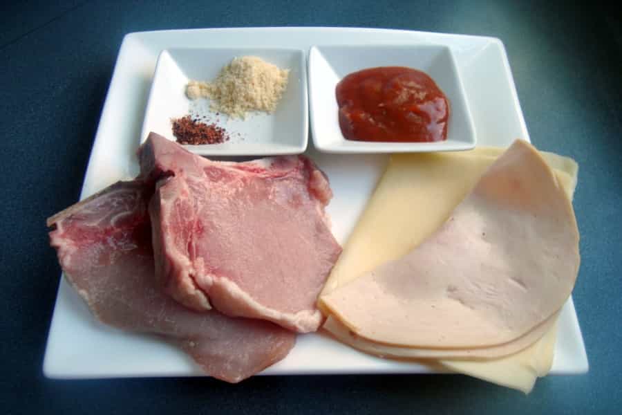 En una bandeja apta para el horno disponer la salsa de tomates, distribuir las chuletas. Sobre cada chuleta disponer una lámina de jamón y una lamina de queso. Espolvorear queso rallado y ½ cucharadita de merquén.