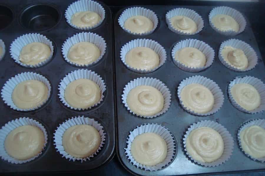 Distribuir la mezcla en moldes de cupcakes con cúpulas de papel (o pirotines), llenar hasta ¾ partes. Hornear en horno precalentado por 15 a 20 minutos o hasta que los cupcakes estén cocidos y un poco dorados. Apagar, retirar del horno, dejar enfriar y reservar.