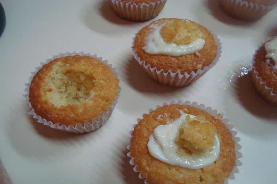 Con un sacabocados o una cuchara pequeña formar un orificio en los cupcakes, rellenar con la crema de pie de limón. Repetir la operación con todos los cupcakes.