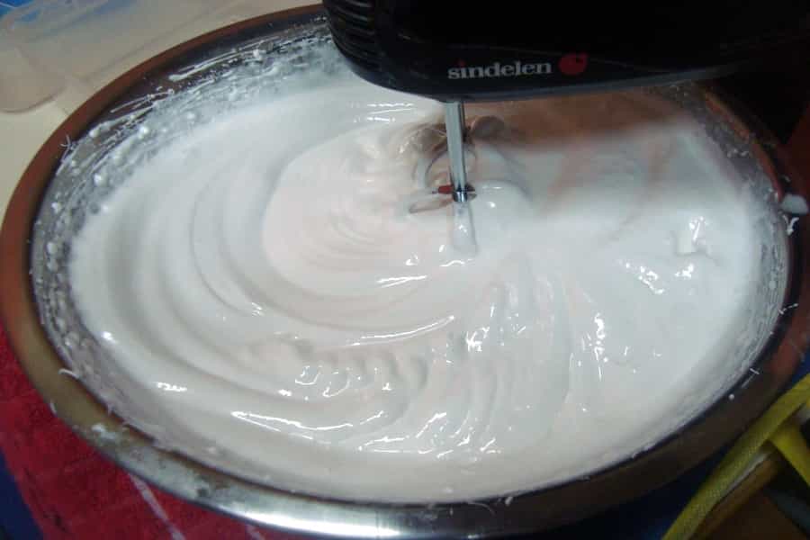 En un pocillo colocar 6 claras y 400 gramos de azúcar, batir con un tenedor o con un batidor de globo hasta que el azúcar se haya disuelto. (No deben quedar cristales de azúcar). Cuando el azúcar este disuelta colocar el pocillo sobre una olla con agua caliente y cocinar a baño maría, batiendo el merengue con batidora, hasta que este firme (unos 15 minutos).