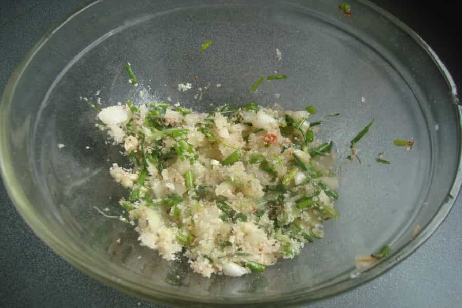 En un recipiente mezclar panko o pan rallado, ajo picado, cebolla picada fina, romero, tomillo, ciboulette y cebollín, agregar 2 cucharadas de aceite y salpimentar a gusto.