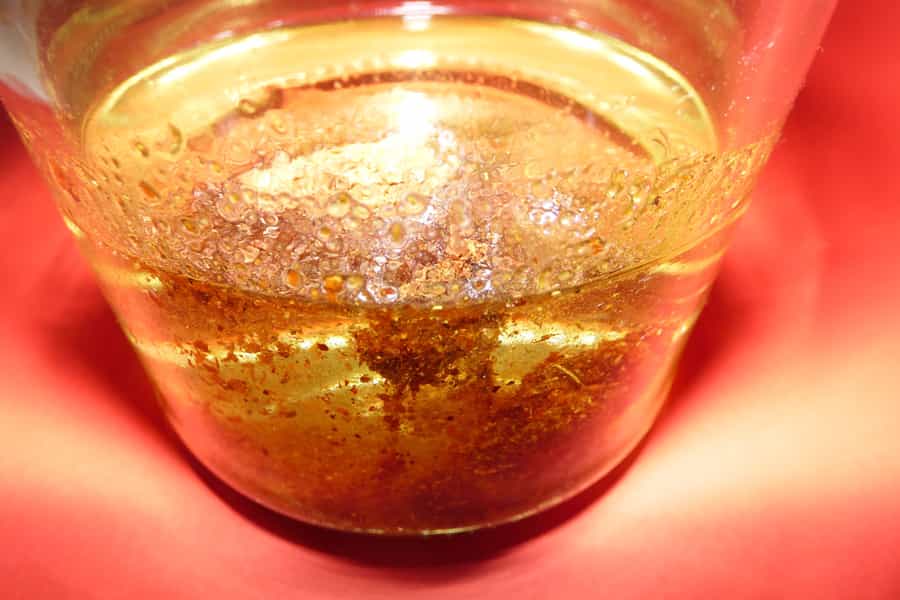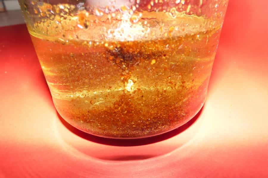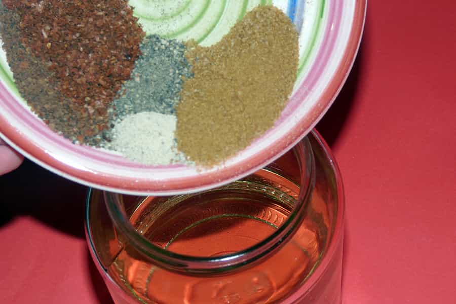Vierte el aceite en un frasco. Luego agrega los condimentos lentamente. Sin revolverlos.
