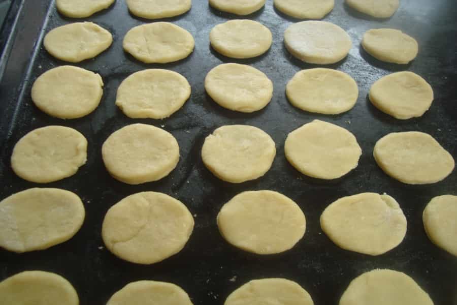 Espolvorear la mesa con harina y estirar la masa, cortar círculos y colocarlos en una lata para horno enmantequillada. Hornear en horno medio precalentado por 10 a 15 minutos, deben dorarse solamente las bases. Retirar y dejar enfriar. Rellenar con manjar y reservar.