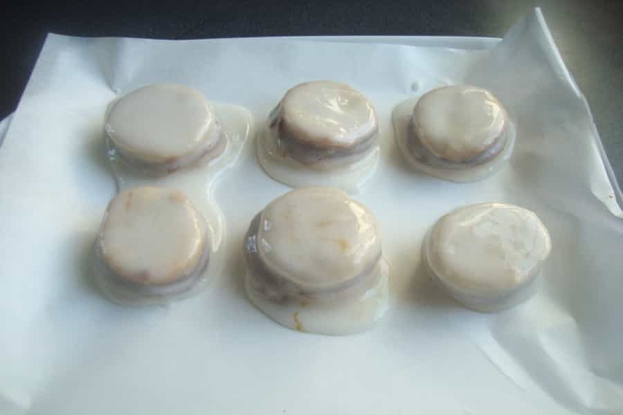 El glaseado debe extenderse con facilidad, si es necesario puedes agregar un poco de agua caliente hasta obtener una consistencia semi liquida. Disponer los alfajores rellenos sobre un papel mantequilla o sobre un plástico y bañarlos con el glaseado. Una vez que estén secos puedes darle otra capa de glaseado. Dejar secar y servir.