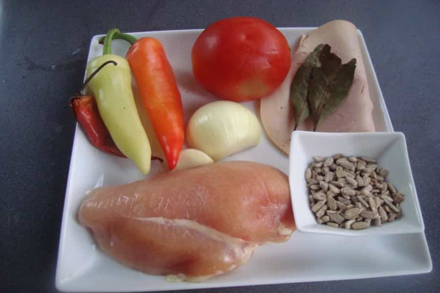 En una juguera o una procesadora triturar las pepitas de zapallo, 1 cebolla los tomates pelados, 2 dientes de ajo y el ají lavado y sin semillas. Se debe obtener una salsa más bien liquida.