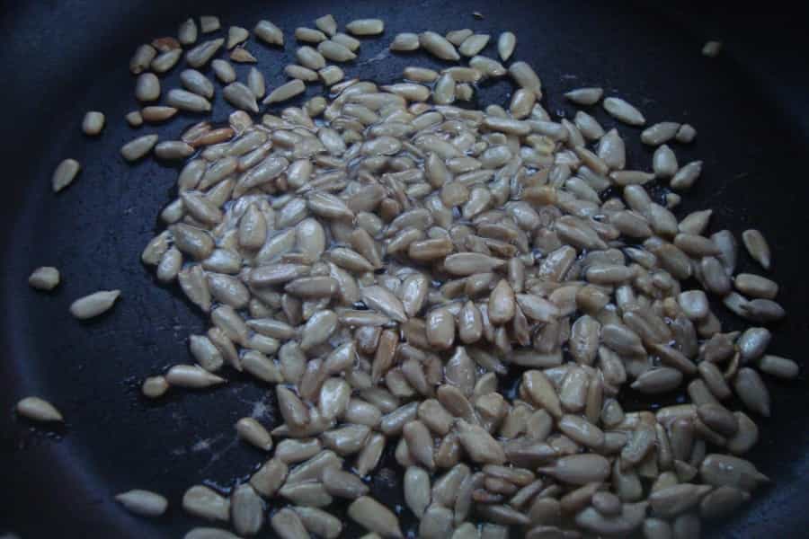 En un sartén con 1 cucharada de aceite caliente sofreír las pepitas de zapallo hasta que estén levemente doradas.