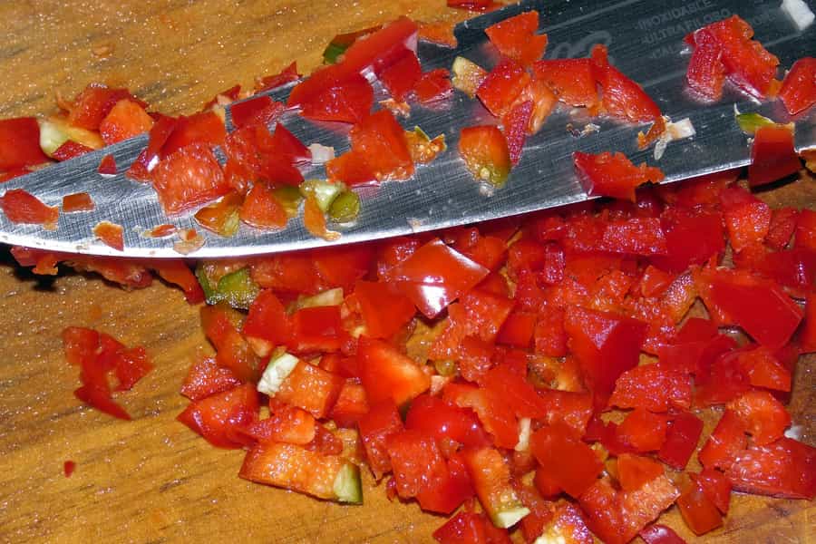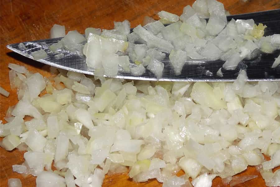 Luego pico la cebolla en cuadritos junto al ajo y el pimentón.