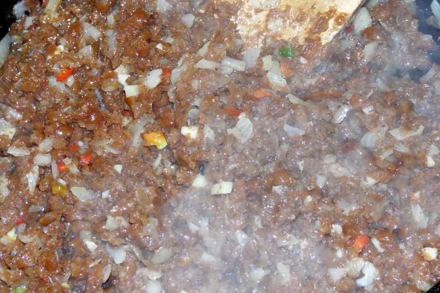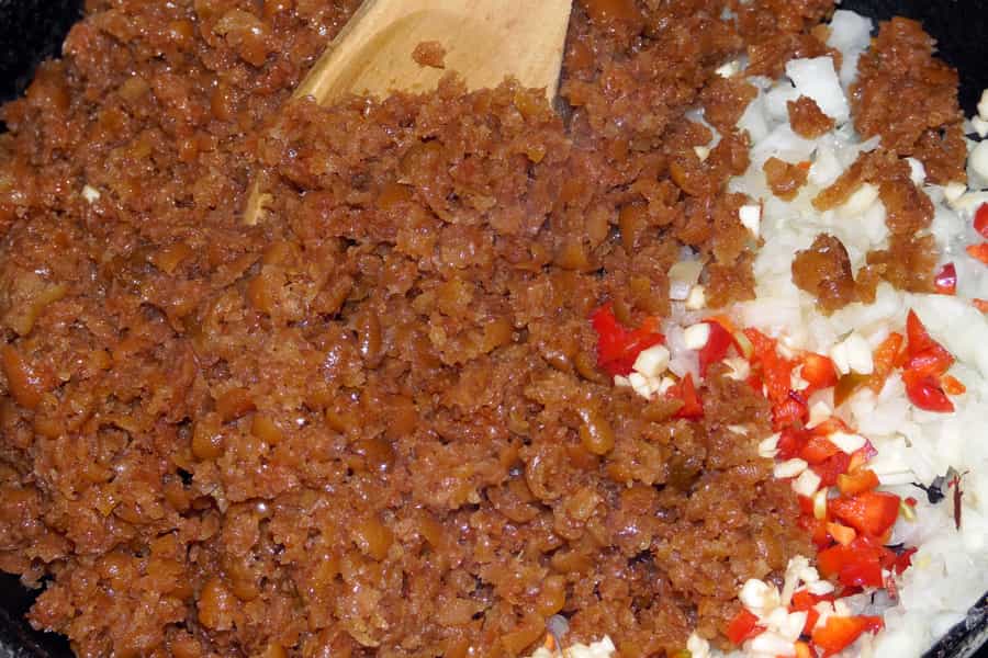 Luego lo mezclamos con la cebolla, el ajo y el pimentón y lo cocinamos a fuego medio, hasta que la cebolla adquiera sea transparente.