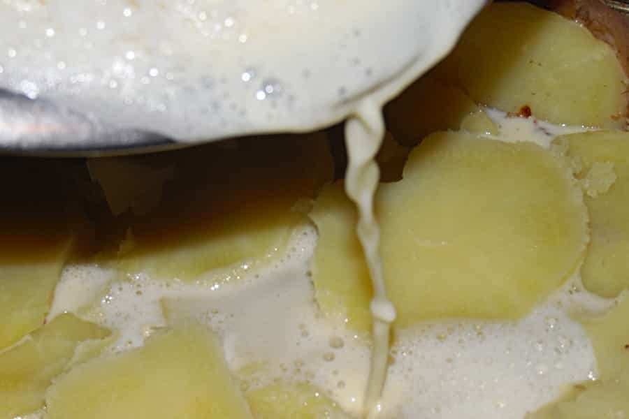 En una budinera, previamente aceitada, colocamos las papas cortadas en rodajas y la cubrimos completamente.